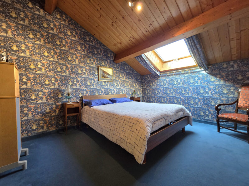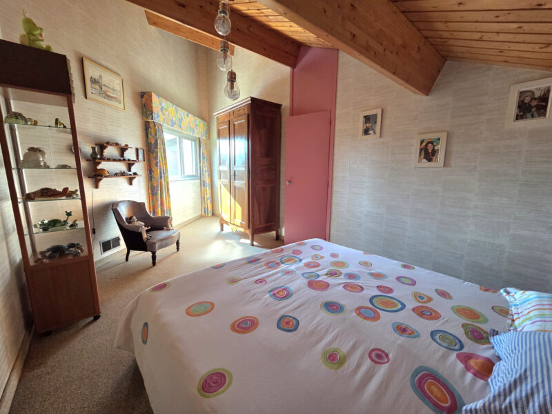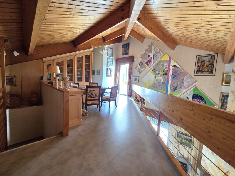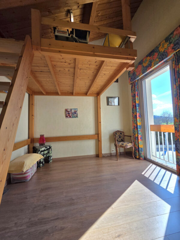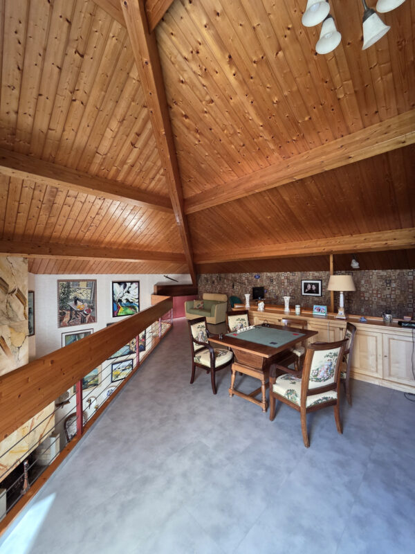 A l’étage, une grande mezzanine avec bibliothèque en bois massif idéal pour un espace bureau, 3 chambres dont une avec mezzanine, un espace détente et une salle de bain avec baignoire et WC.