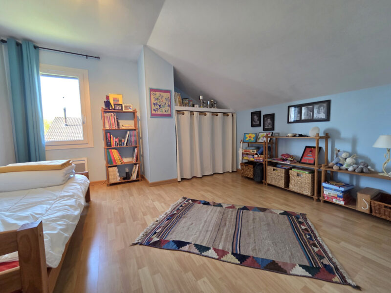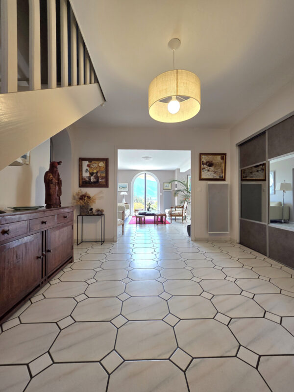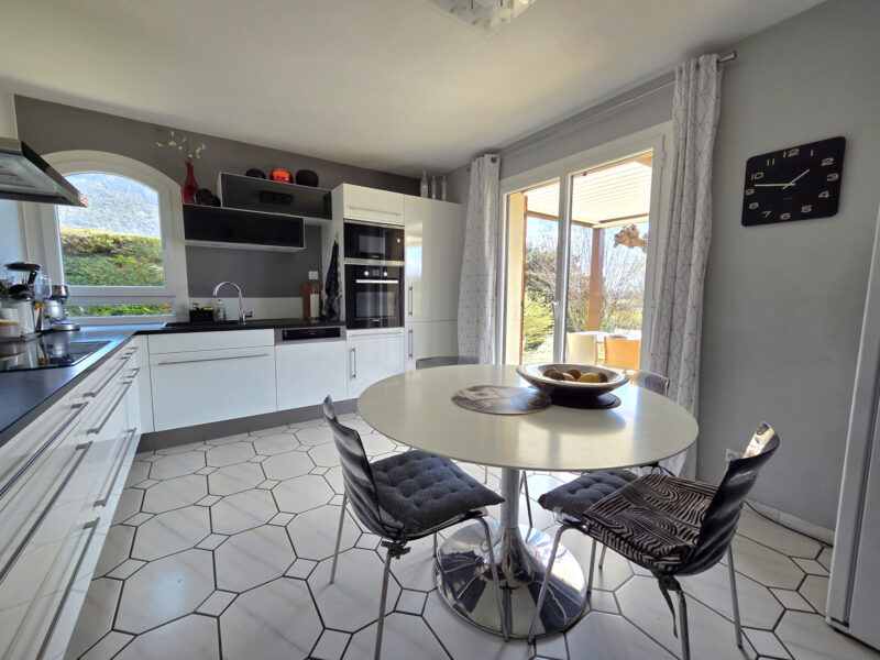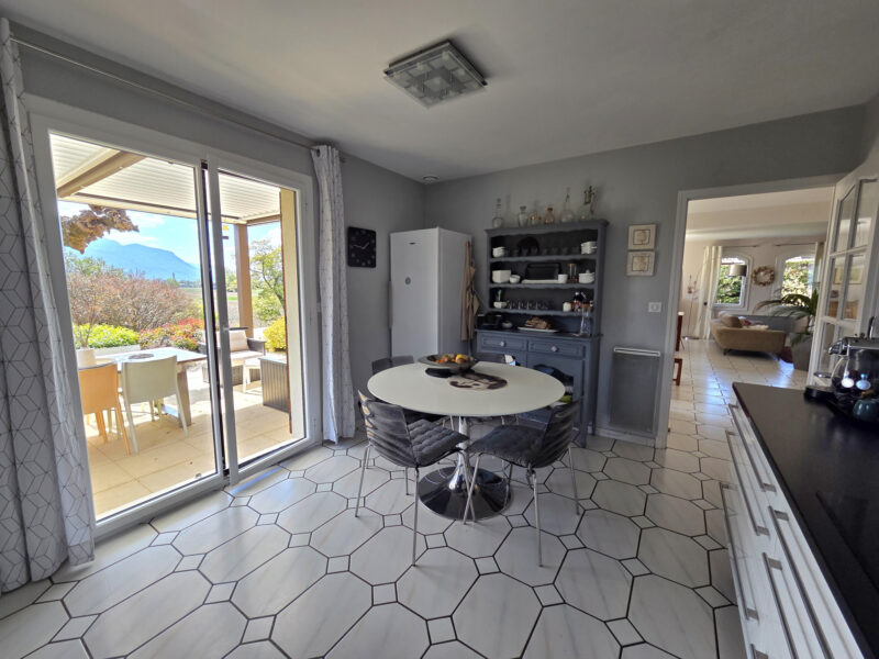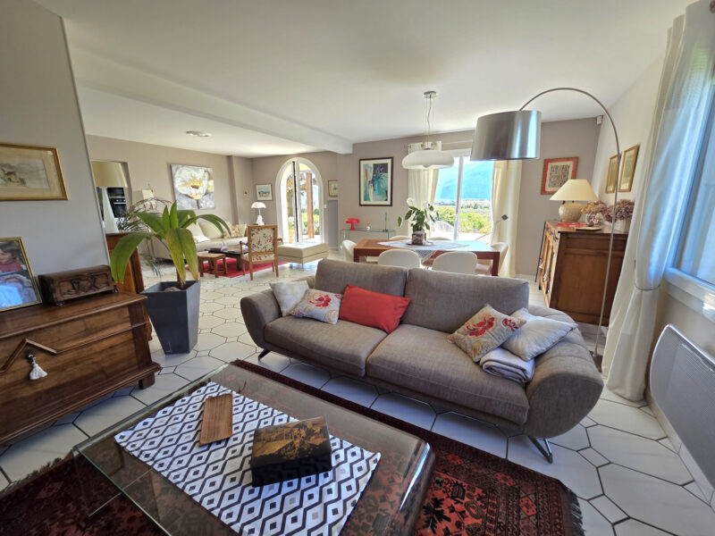 Cette maison de construction traditionnelle vous offre au rez-de-chaussée une entrée avec rangements, une cuisine équipée moderne de 14.5 m2 donnant sur terrasse, un salon salle à manger de 45 m2 lumineux avec vue sur les montagnes et donnant sur l’extérieur, 1 chambre/bureau de 10 m2, 1 grand cellier, 1 buanderie, 1 WC, 1 garage de 24 m2 avec mezzanine.