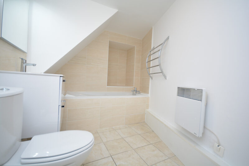 Cuisine équipée ouverte sur séjour, 1 salle de bain avec baignoire et WC.