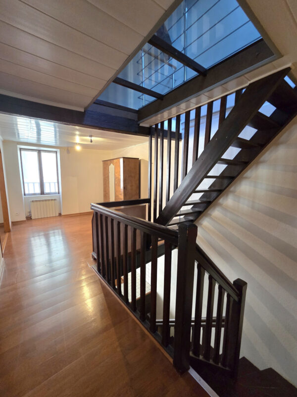 A l’étage : 1 chambre, 1 espace de 10 m2 pouvant servir de bureau, 1 salle de bain, 1 WC.