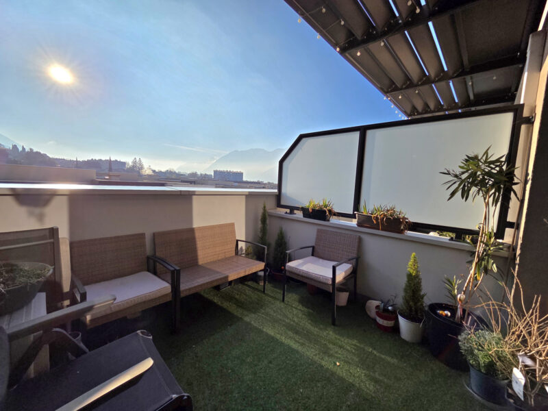 Terrasse de 7 m2 exposée SUD avec vue dégagée.