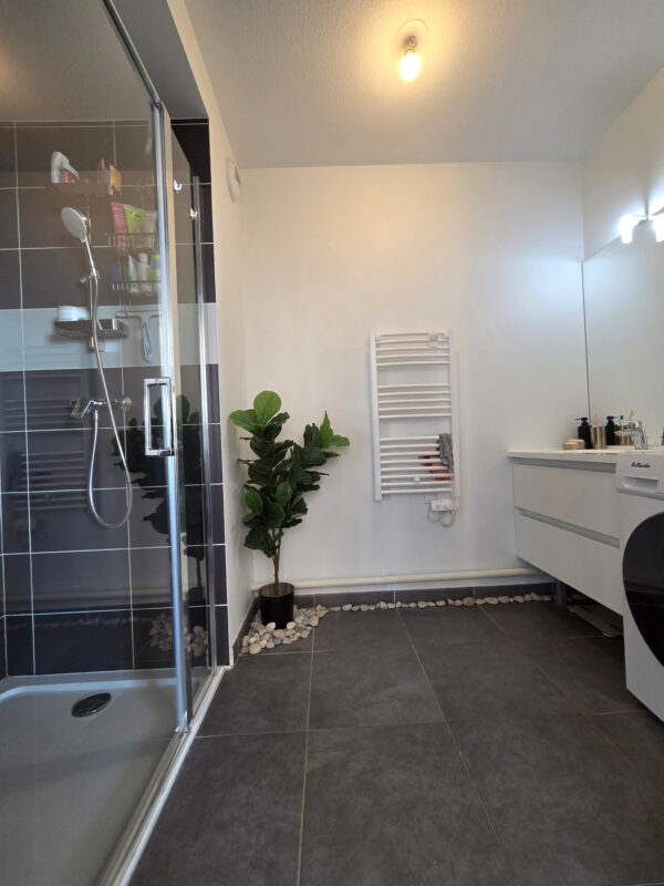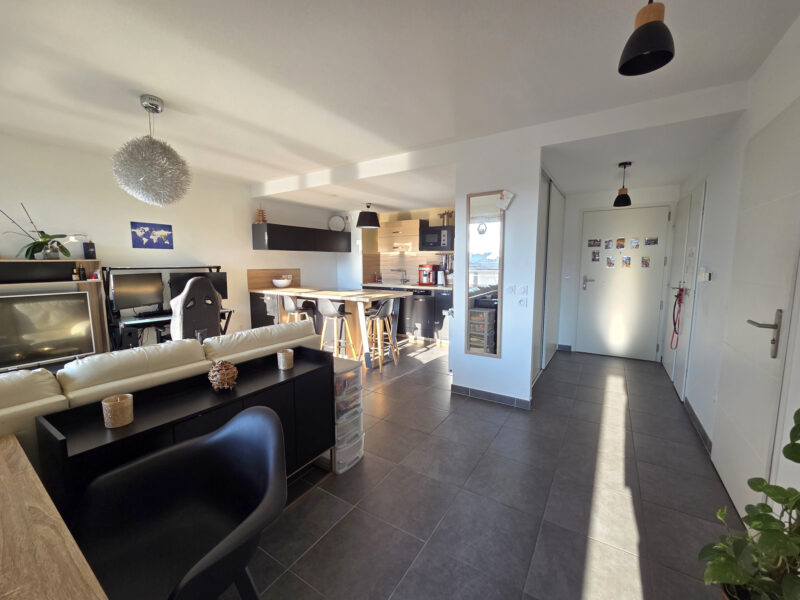 Ce bel appartement lumineux vous offre une entrée avec placard, un cellier pour rangement, une chambre climatisée avec placard, un WC séparé, une salle d’eau avec douche, une cuisine équipée moderne ouverte sur séjour.