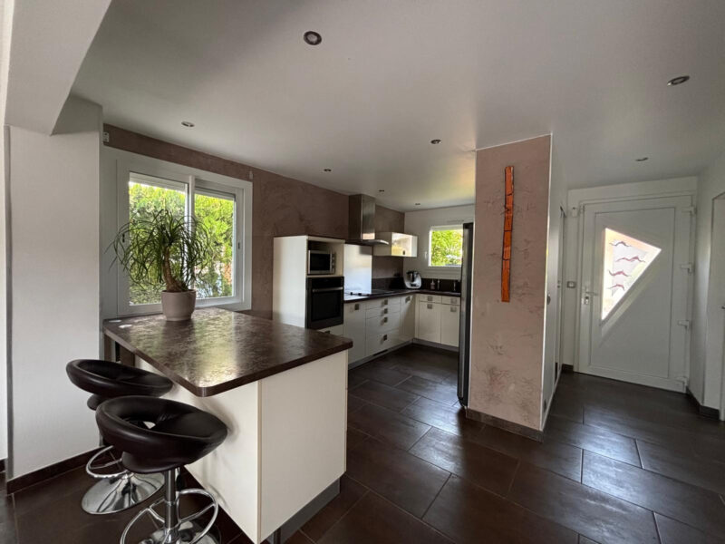 Maison rénovée en parfait état, menuiseries double vitrage et volets roulants électriques, chauffage au gaz de ville, cuisine équipée.