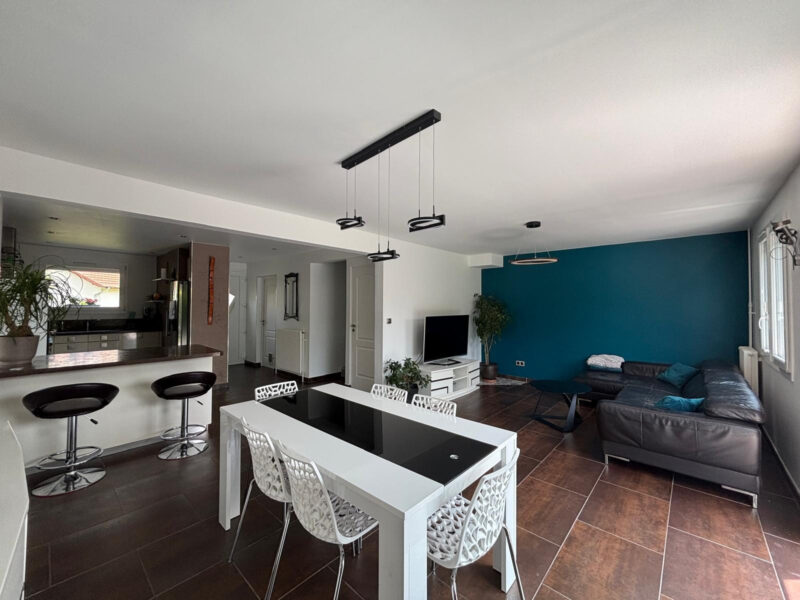 Maison mitoyenne d’un côté sans gêne, de 101 m2 comprenant au rez-de-chaussée une pièce de vie lumineuse de 42 m2 avec cuisine équipée ouverte sur séjour, entrée avec placard, WC, buanderie, garage.
