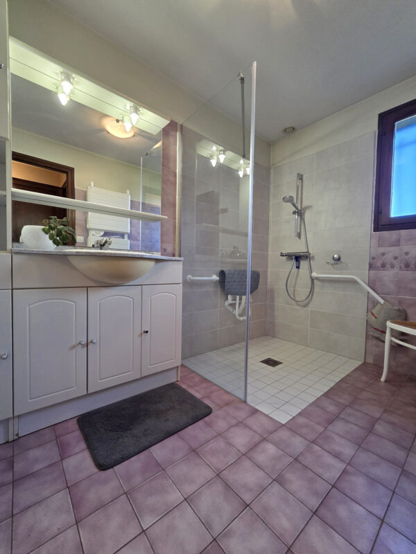 Au rez-de-chaussée, vous trouverez une entrée avec placard, un salon/salle à manger de 45 m2 lumineux, une cuisine de 14 m2, une chambre et une grande buanderie (pouvant devenir chambre), un WC séparé, une salle de douche.