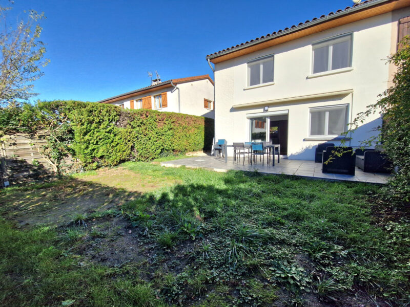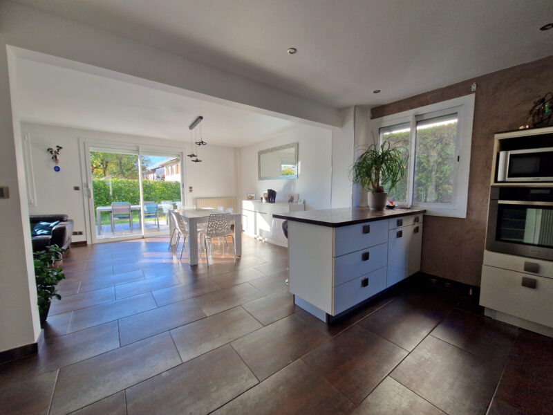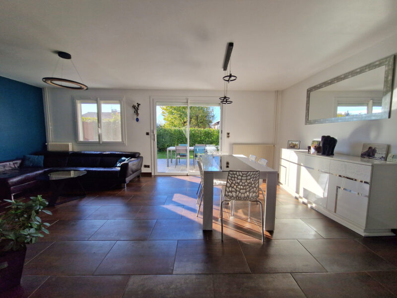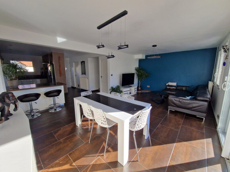 Maison mitoyenne d’un côté sans gêne, de 101 m2 comprenant au rez-de-chaussée une pièce de vie lumineuse de 42 m2 avec cuisine équipée ouverte sur séjour, entrée avec placard, WC, buanderie, garage.