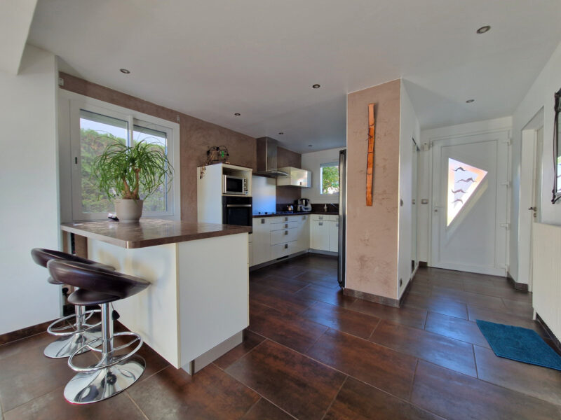 Maison rénovée en parfait état, menuiseries double vitrage et volets roulants électriques, chauffage au gaz de ville, cuisine équipée.