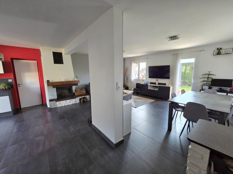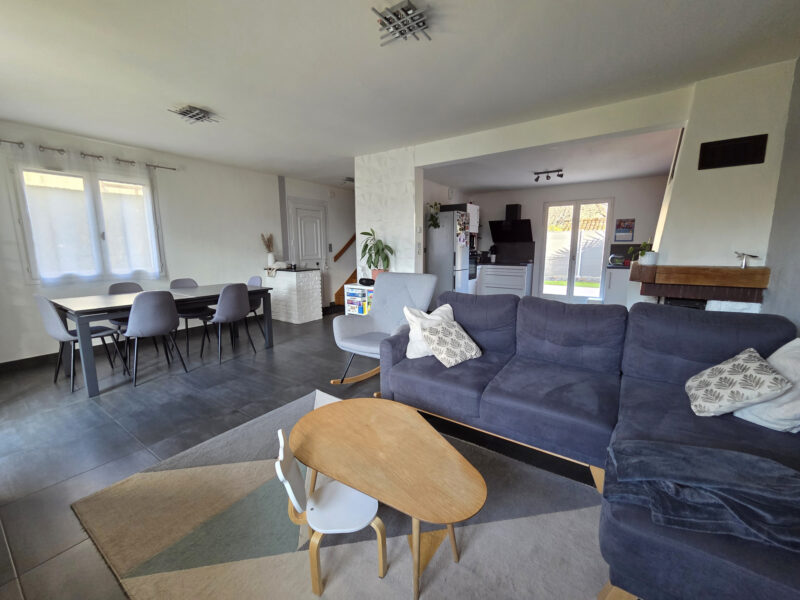 Cette maison en parfait état vous offre au rez-de-chaussée une grande pièce de vie de 41 m2 avec cuisine équipée ouverte sur séjour, salle à manger, un WC, une buanderie et un garage de 17 m2.